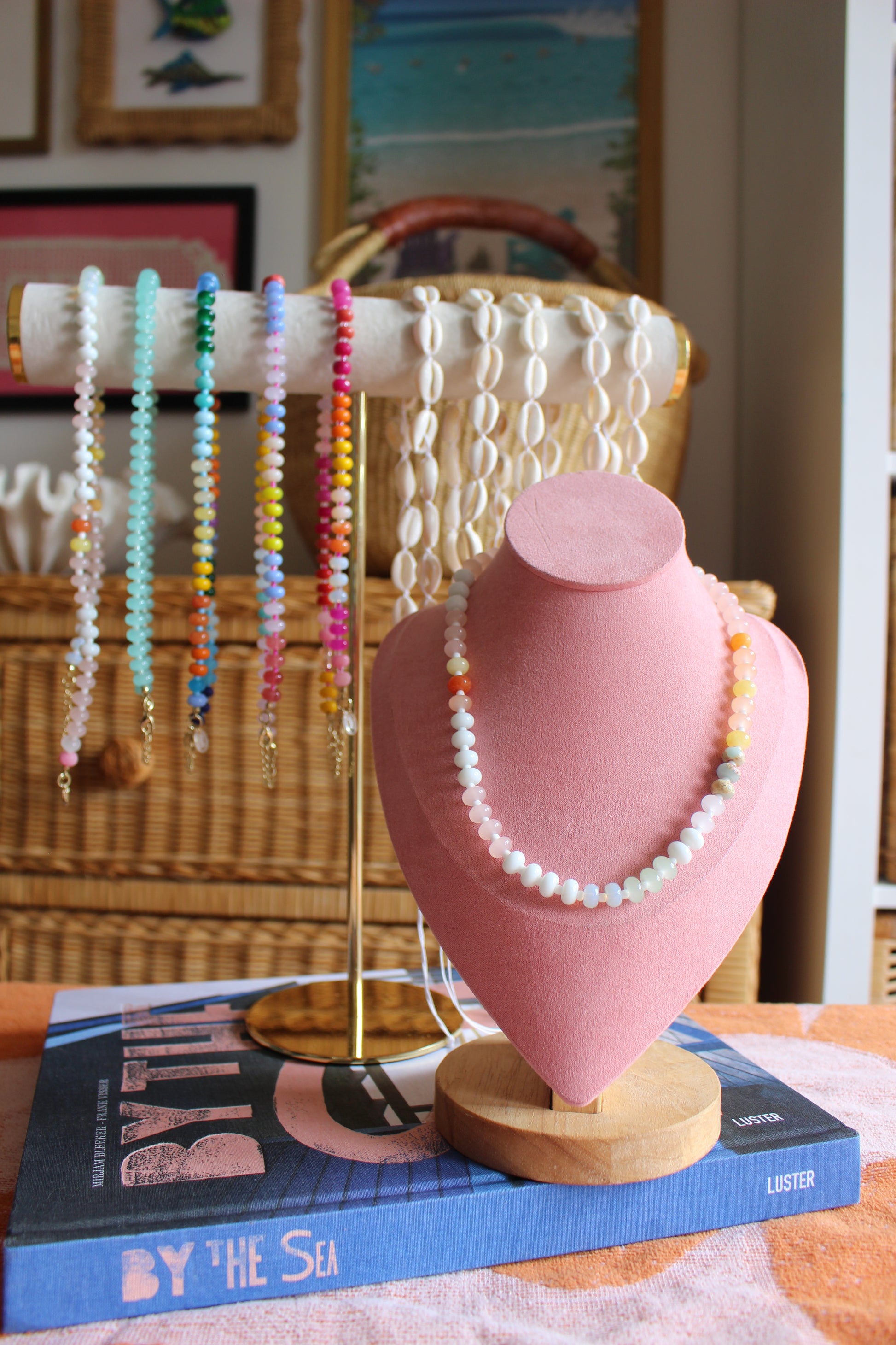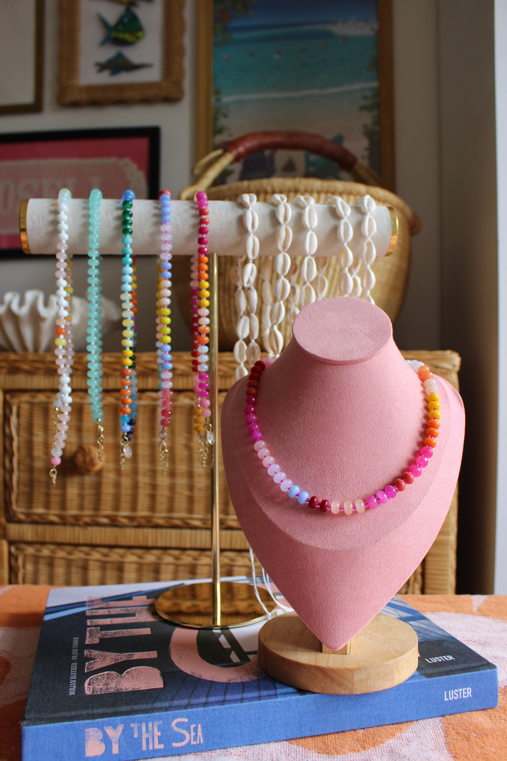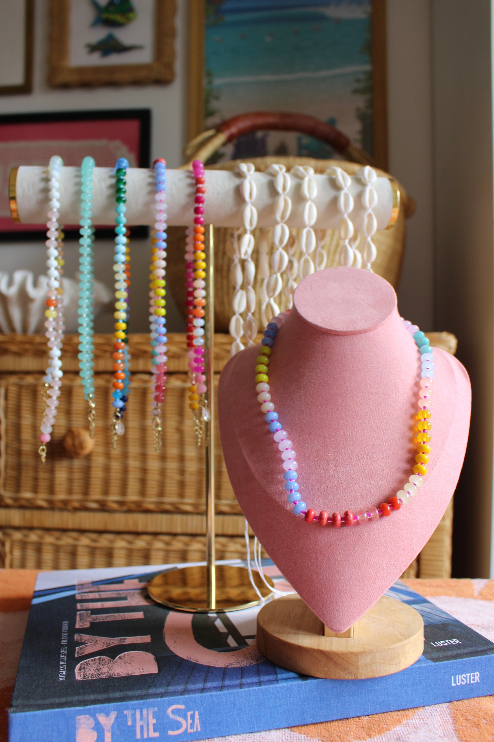 Colorful beaded necklaces on an adjustable gold plated clasp