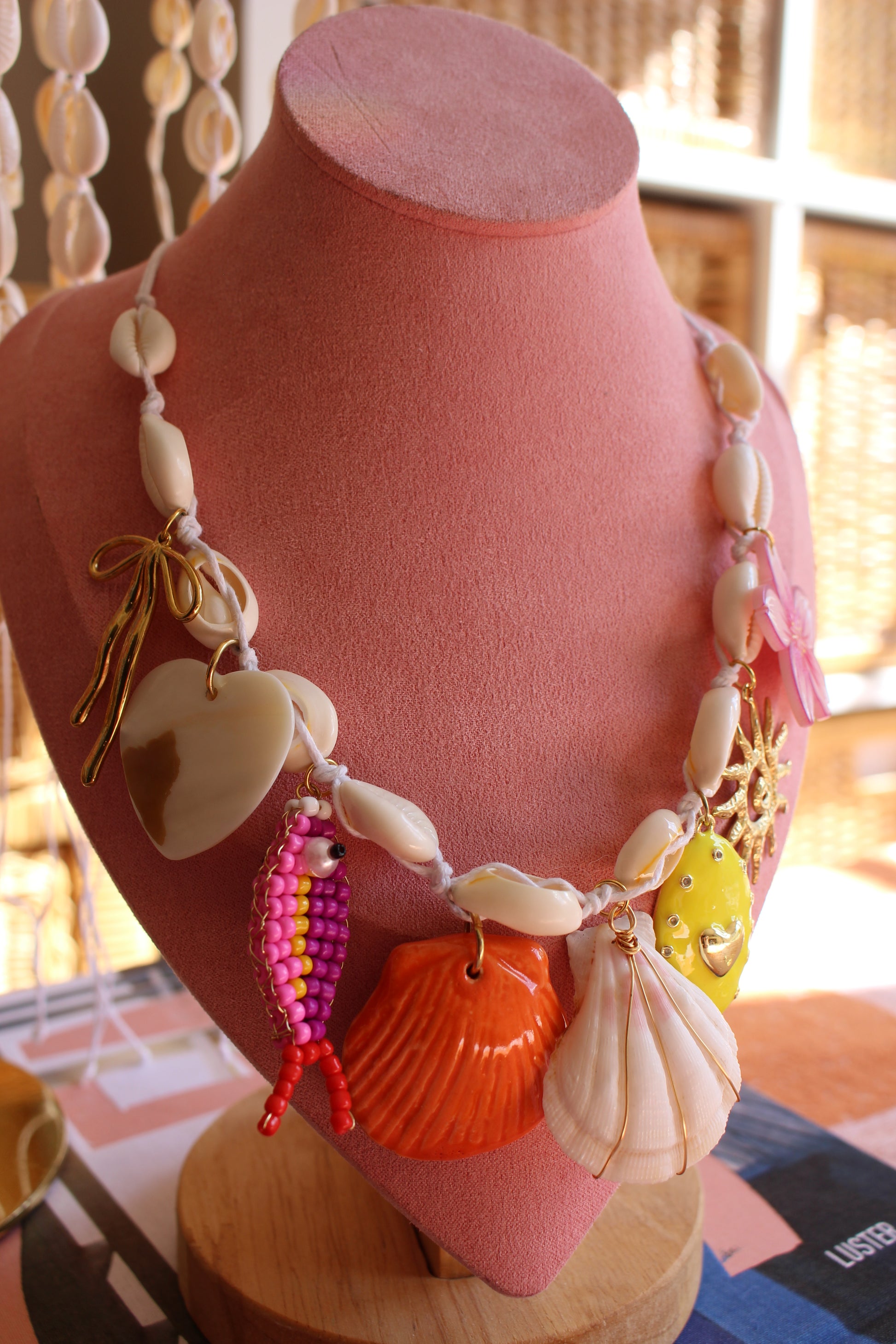 8 Charms on an adjustable cowrie shell necklace, with a clasp
